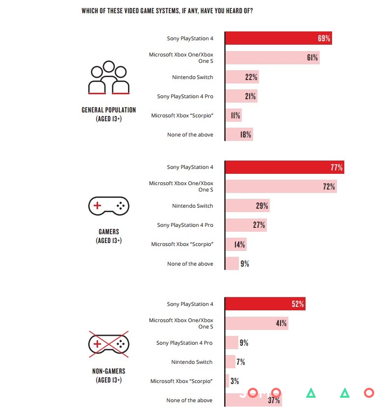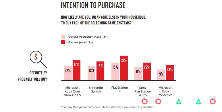 Dicho estudio se centra en los usuarios estadounidenses con más de 13 años de edad. Los jóvenes tienen cierta inclinación por Project Scorpio, pues el 13% de la totalidad de los participantes confirmó que adquirirán la nueva consola de Microsoft. Sin embargo, PlayStation 4 Pro es uno de los sistemas más solicitados, con la aprobación del 15% de los participantes. Entre las consolas que más personas tienen pensamiento de comprar, se encuentran Nintendo Switch (16%), el modelo estándar de PlayStation 4 (21%) y Xbox One (17%).