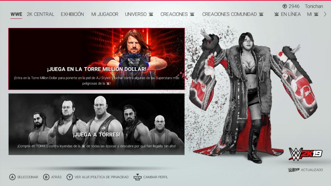 Modo MiCarrera han añadido una fase extra antes de comenzar en NXT. En esta ocasión, WWE 2K19 hace un nuevo guiño al hecho impepinable de que hay vida más allá de WWE. Tras crear nuestra propia Superstar comenzaremos en las independientes, en una promoción ficticia llamada Blade Championship Wrestling. Mejoraremos nuestro juego y Matt Bloom se fijara en nosotros, lo que nos abrirá las puertas a la primera división Modos Torres una de las novedades de WWE 2K19 es este modo. Se trata de varios desafíos temáticos (mujeres, cruceros, Mi Superstar) en los que tendremos que superar para obtener recompensas si superamos la Torre por completo. Ademñas con el tiempo irán añadiendo mas Torres y gratis.