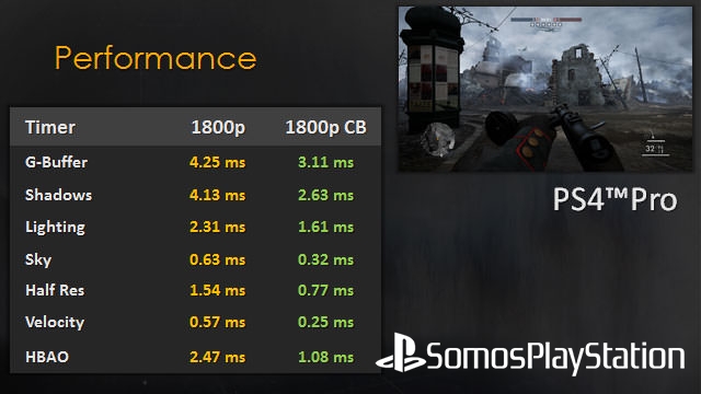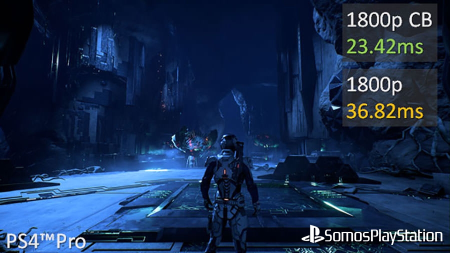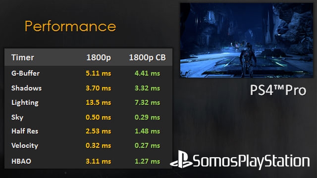 Como se puede apreciar en la imagen, gracias al ‘Checkerboard’ de PlayStation 4 Pro han podido acelerar el juego en distintos apartados técnicos, mejorando notablemente en aspectos como sombras, iluminación y velocidad.