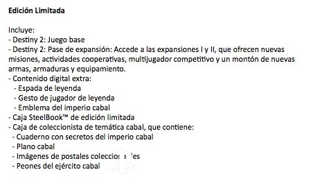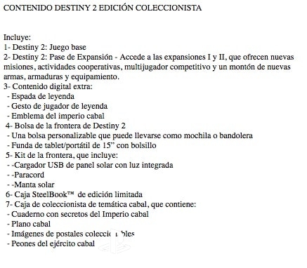 Según se puede apreciar, la edición coleccionistas de Destiny 2 incluirá el pase de temporada que dará acceso a dos expansiones y contenido digital extra, además de una bolsa de la frontera, kit formado por un cargador USB con panel solar, un paracord y una manta solar, caja metálica y un cuaderno de secretos del Imperio Cabal.