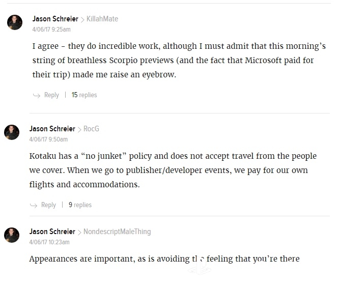 Un ejemplo claro ha sido Kotaku, o para ser más específicos, Jason Schreier, uno de sus redactores. Una vez redactada la noticia que hablaba con un tono más que cuestionable sobre la cobertura de tan importante evento, Jason utiliza los comentarios de su web poniendo en duda la credibilidad de Digital Foundry.