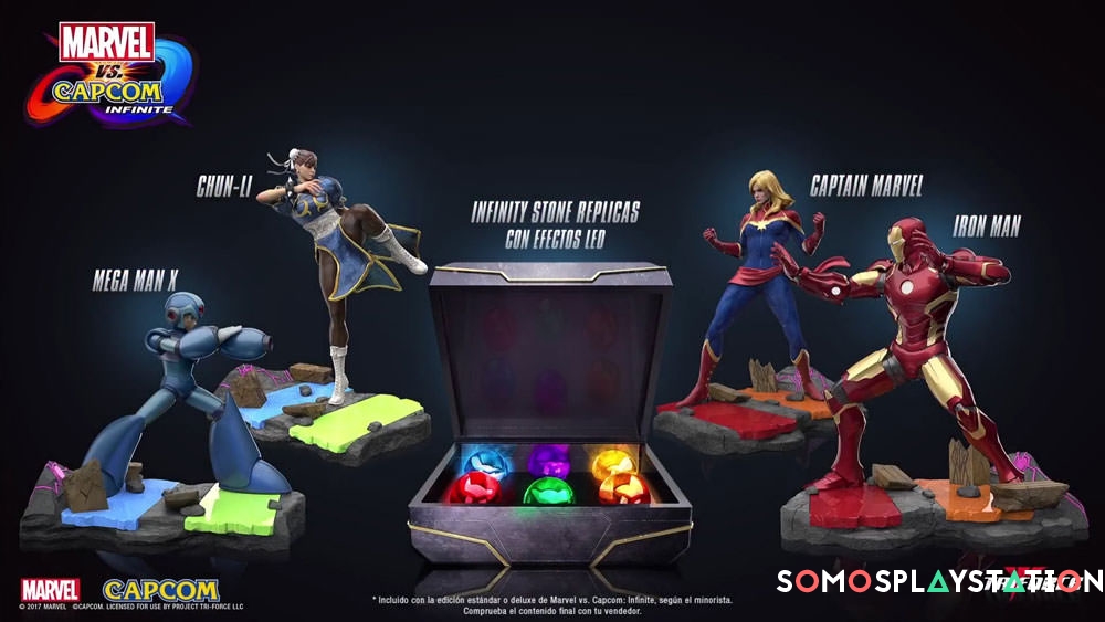 Esta exclusiva edición tendrá un precio $199 dólares y recibiremos una copia Deluxe de Marvel vs. Capcom: Infinite que estará acompañada de dioramas de 4 de los personajes principales del juego ―Iron Man, Captain Marvel, Mega Man X y Chun-Li― y una caja con réplicas de las 6 Gemas del Infinito.