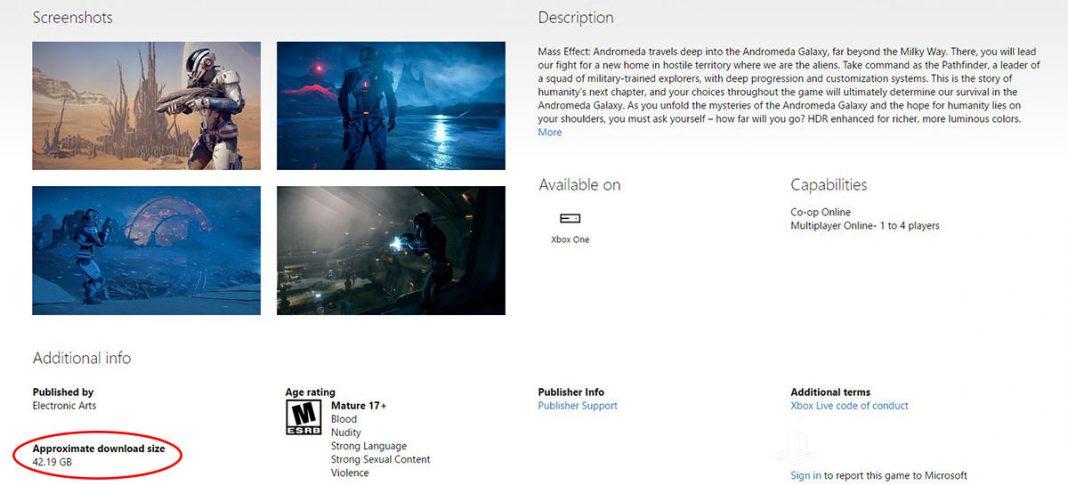 Gracias a la tienda de Xbox conocemos cuánto ocupará el nuevo juego desarrollado por BioWare. Para poder disfrutar de Mass Effect: Andromeda en nuestra consola, tendremos que tener disponibles en nuestro disco duro 42.19 GB de espacio. Se supone que tanto la versión para Xbox One como para PlayStation 4 serán similares, por lo que este tamaño variará muy poco entre ambas plataformas.