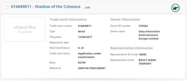 Sony ha logrado que no se filtre nada antes de la celebración de su gran conferencia en el E3 2017, que arranca a las 3:00 de la madrugada de este lunes al martes aquí en España. Pues bien, según los últimos registros en la oficina de patentes y marcas de la UE, todo parece indicar que Shadow of the Colossus hará acto de presencia en cualquier momento durante el evento.